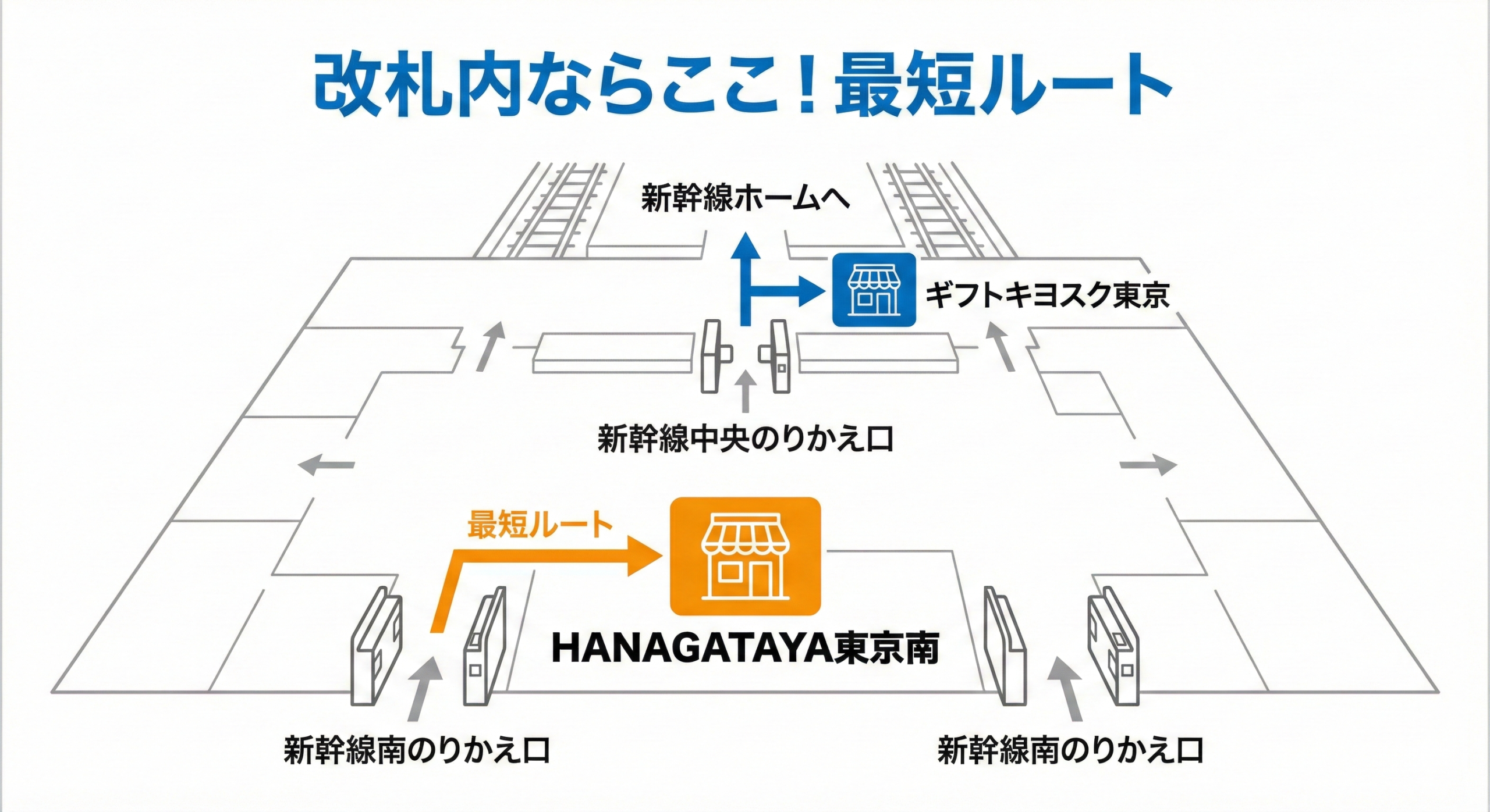 - 改札内なら: 南のりかえ口前の「HANAGATAYA東京南」へ。